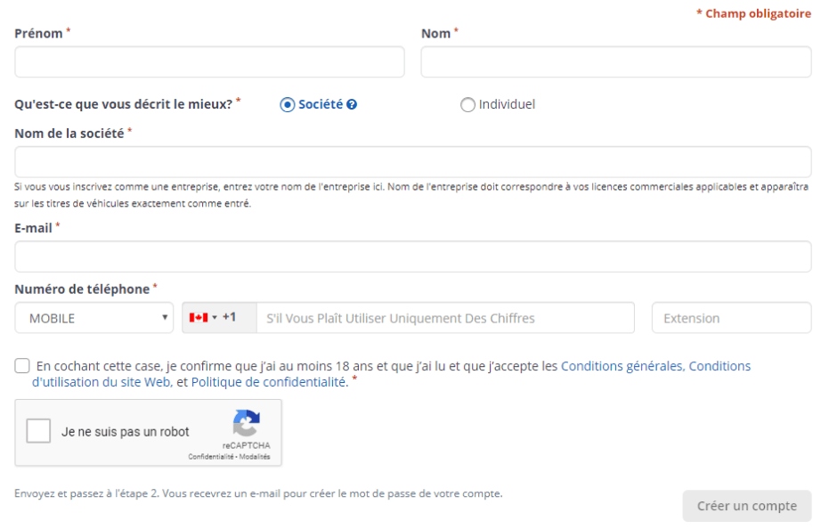 La première étape vous donne la possibilité de vous inscrire en tant qu’entreprise ou particulier. (Rappelez-vous, au Canada, tous les véhicules situés dans toutes les provinces sauf l’Alberta nécessiteront une licence commerciale pour pouvoir enchérir.) Vous ne savez pas si vous serez admissible pour enchérir sur un véhicule? Consultez notre carte Aide pour les licences pour obtenir plus d’informations sur les exigences en matière de licences pour chaque province.